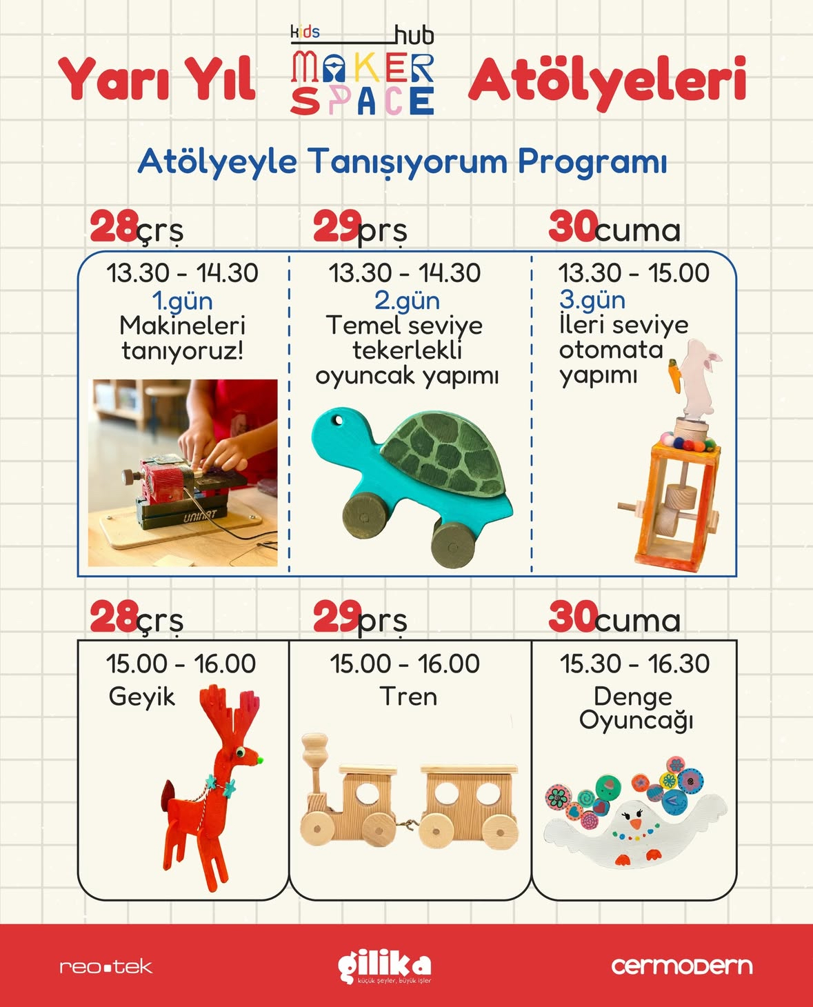 Her hafta farklı bir oyuncak tasarımı ve yepyeni bir deneyim için sizleri Cermodern’e bekliyoruz! Üreterek öğrenmenin keyfini çıkarmaya hazır olun!